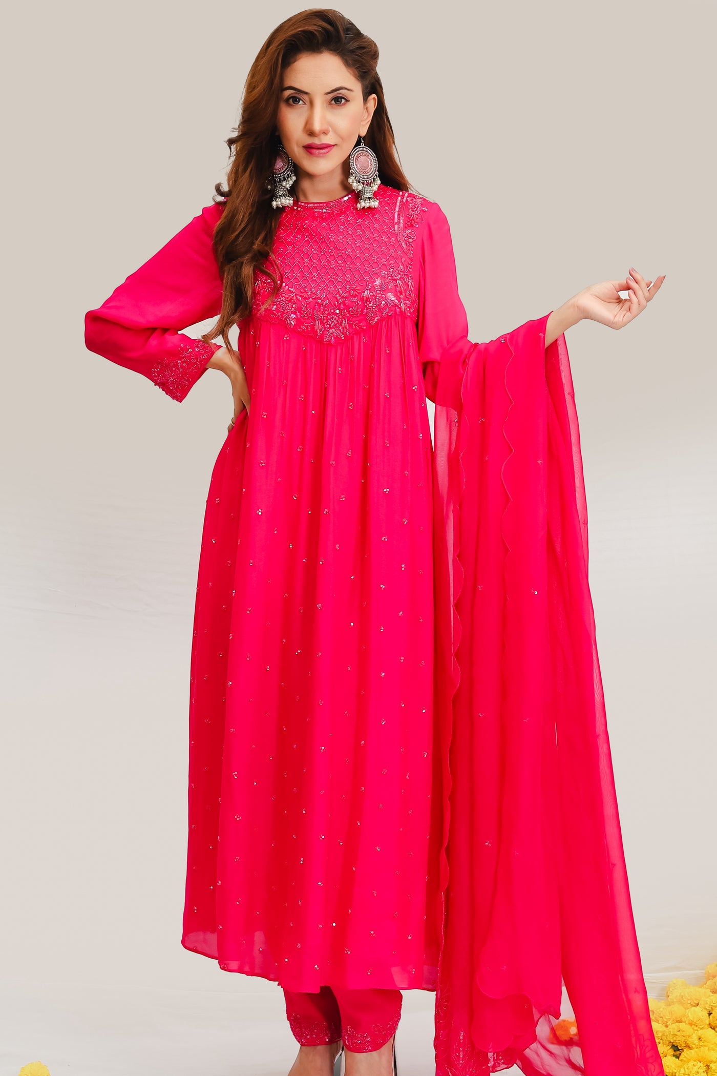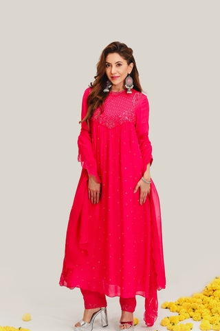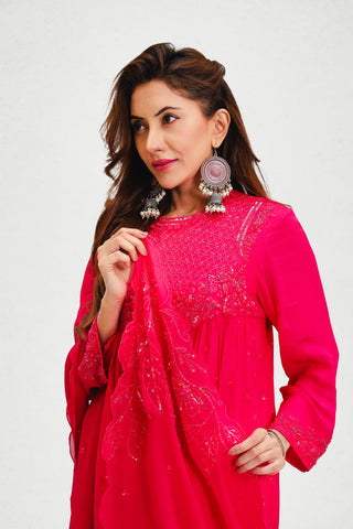 A graceful pink Anarkali in crepe, paired with cotton satin pants and an organza dupatta. Embellished with bead, sequin, cutpipe, and crystal embroidery, and finished with a soft butter crepe lining.